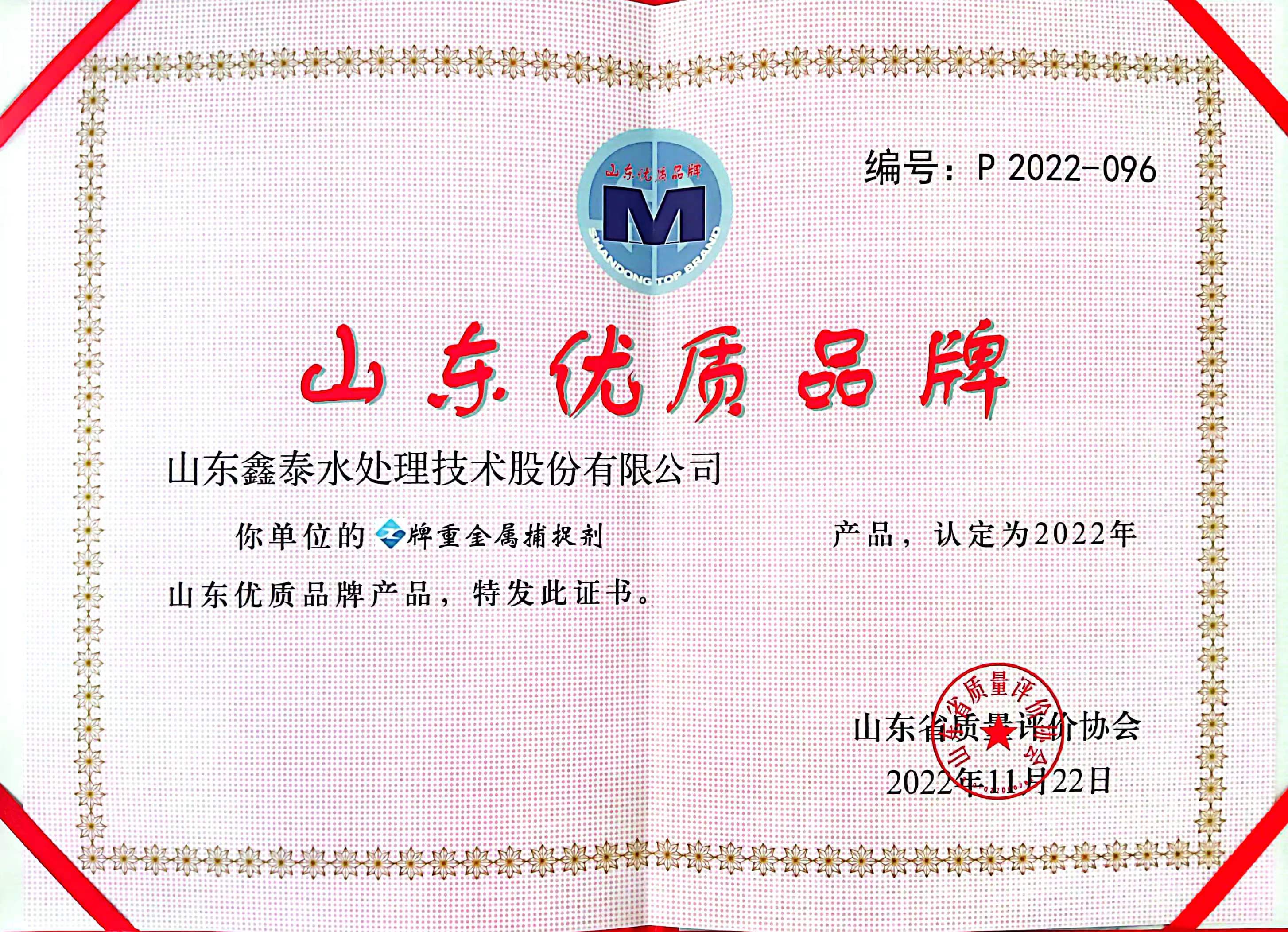 近日,山東(dōng)省質量評價協會公布瞭(le)2022年山東優質品牌産(chǎn)品認定結果,山東鑫泰水處(chù)理技術股份有限公司生産(chǎn)産(chǎn)品“重金屬捕捉劑”入選“2022年山東優質品牌産品”。